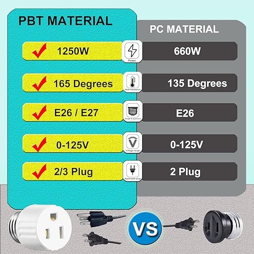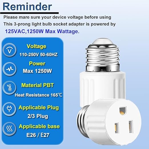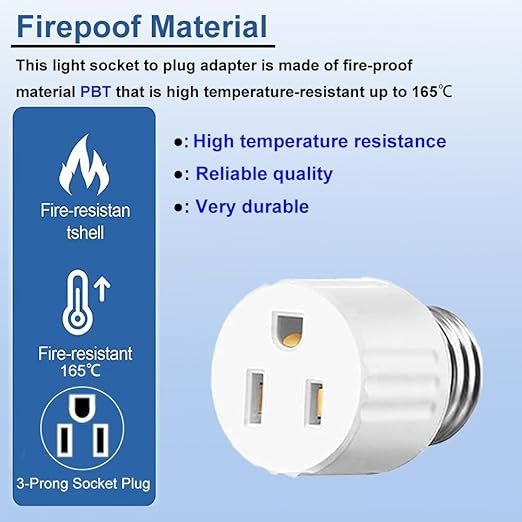 1.This light socket to plug adapter is made of fire-proof material PBT that is high temperature-resistant up to 165℃.This 3-prong light bulb socket adapter is powered by 125VAC,1250W Max Wattage.