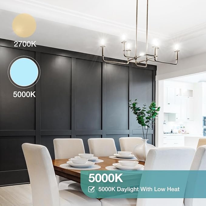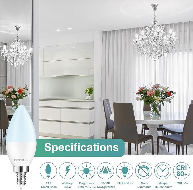 Bright and Gentle Light: Our candelabra led light bulbs offer 650 lumen high brightness to light up your space while maintaining a 5000K daylight white, eye-friendly glow. Perfect for creating a well-lit yet relaxing atmosphere in any room