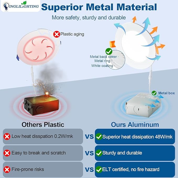 Safe and Reliable LED Recessed Light Fixture: The recessed lighting 6 inch is IC rated for contact with insulation materials in the ceiling, with thermal protection and no fire hazard. The can light 6 inch are also damp rated and can be installed above the shower room. And it also have also passed ELT and FCC certifications, ensuring strict safety and reliability for your home.