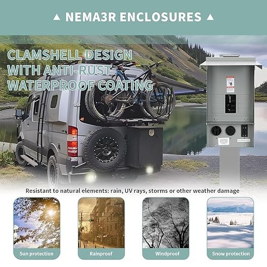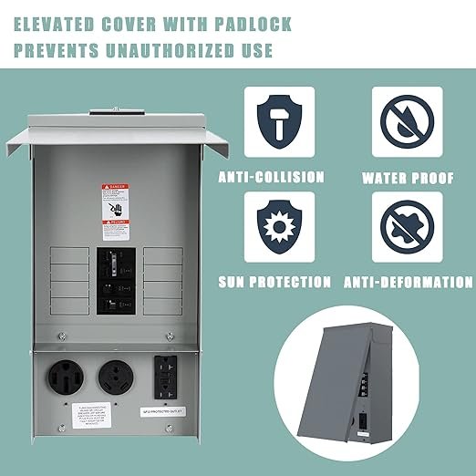 Secure and Durable:the RV circuit breaker box is constructed from steel, with the entire shell of the RV electric outlet panel treated for enhanced corrosion resistance. It effectively protects against water splashes, rain, dust, snow, oil, and UV exposure