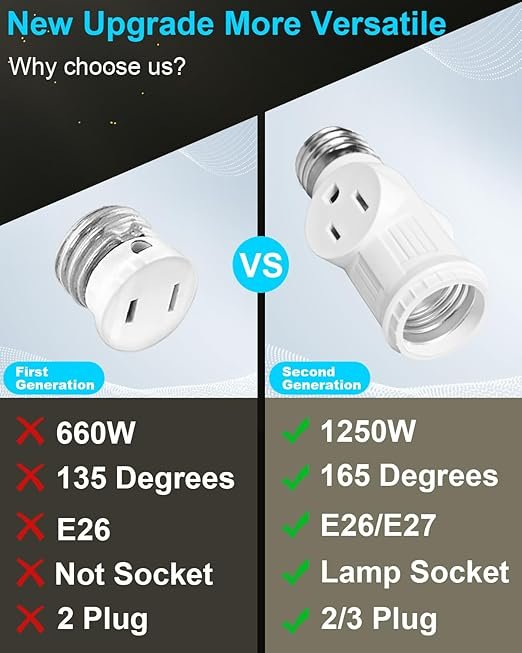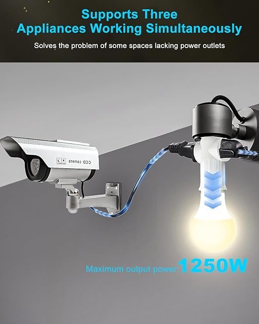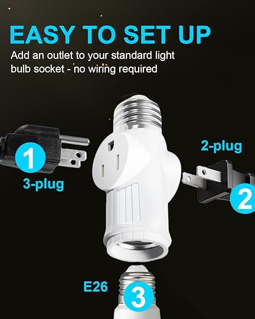 Maximum Power of 1250W: Our light socket plug adapter can support both the 3-prong sockets on the sides and the E26/E27 bulb socket at the bottom simultaneously. It can handle a maximum power of 1250W with a current of 10A, and the bulb socket supports a maximum of 60W bulb, which is double the capacity of ordinary adapters. (Note: This lamp socket to plug adapter is not suitable for connecting high-power appliances. Please check whether the appliances exceed the rated value of this socket before use. This light socket to plug adapter is not suitable for use in humid places. For outdoor use, please use it under a socket with a waterproof lampshade.)